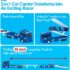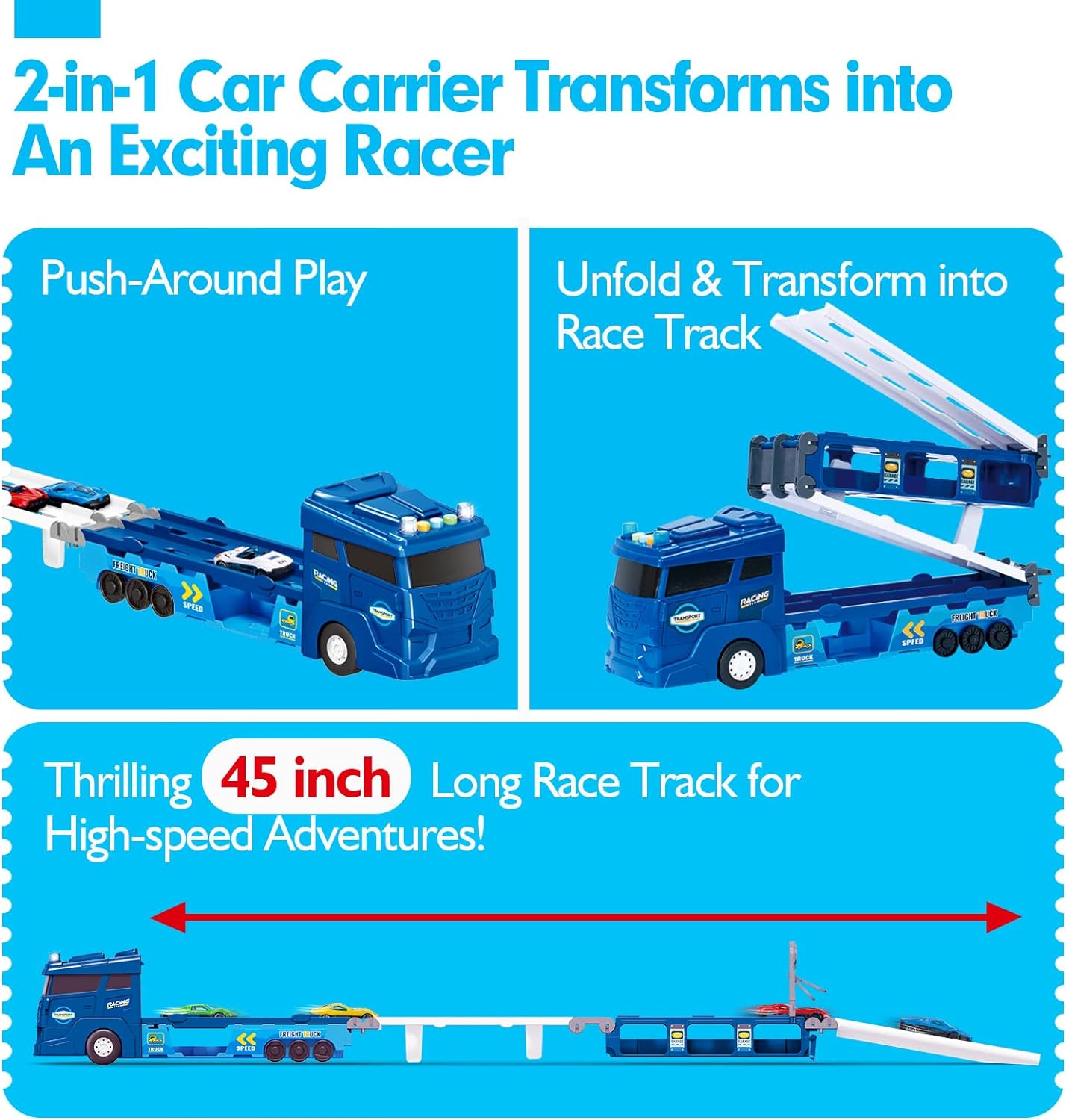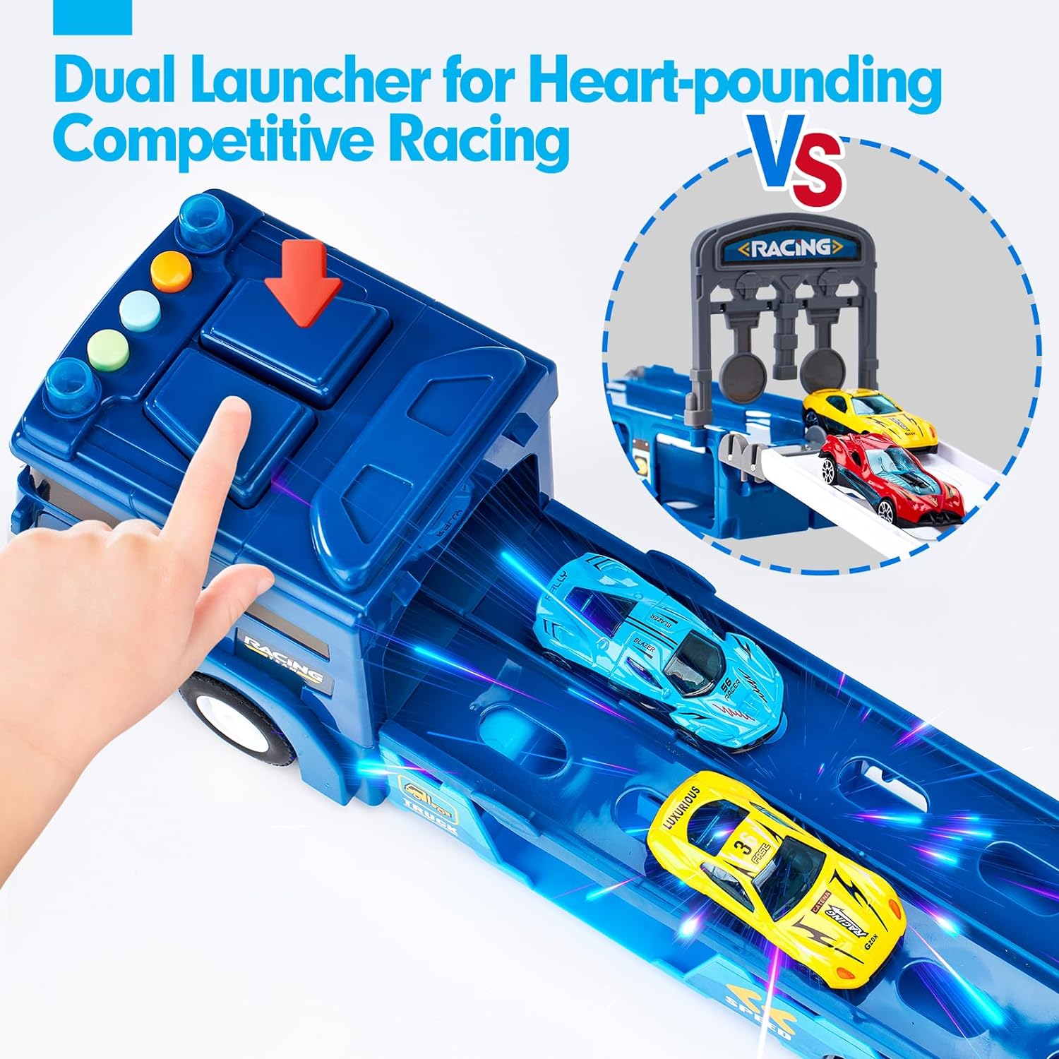 - Transforming Fun & Racing Excitement – The truck not only load up your kid’s favorite toy cars, but also unfold into a thrilling 45 inch long race track with a dual launcher for heart-pounding competitive racing. Push the blue button to send the cars down the track for a heart-pounding race. Who will win the race under the winner’s arch